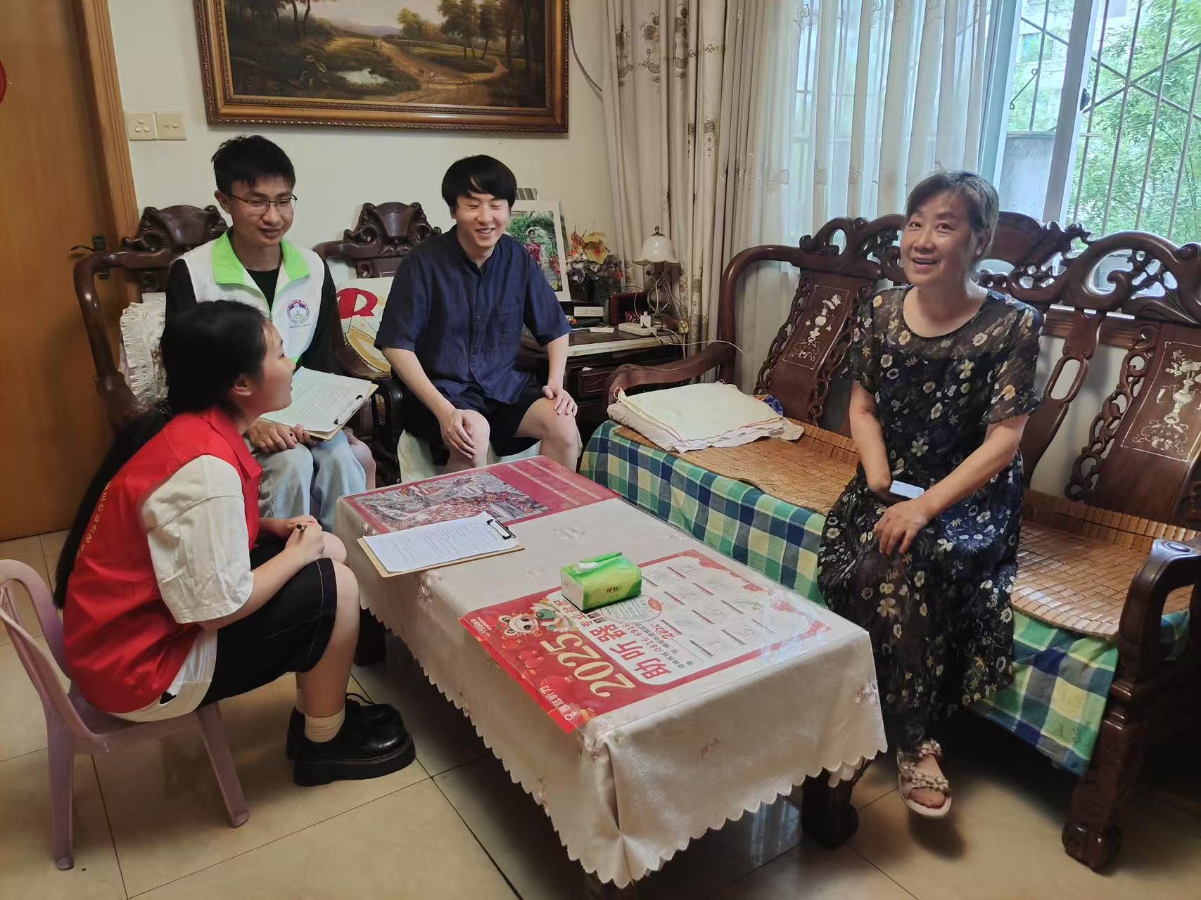 此次访谈以访谈对象的职业经历为核心,同时兼顾日常生活、身体状况等其他问题。访谈过程中,志愿者们灵活关注访谈对象的情绪变化,及时回避敏感问题,巧妙引导老人们分享年轻时的职业生涯。现场氛围温馨融洽,充满欢声笑语。在访谈尾声,几位老人纷纷表达了对大学生志愿者的美好祝愿和衷心感谢。