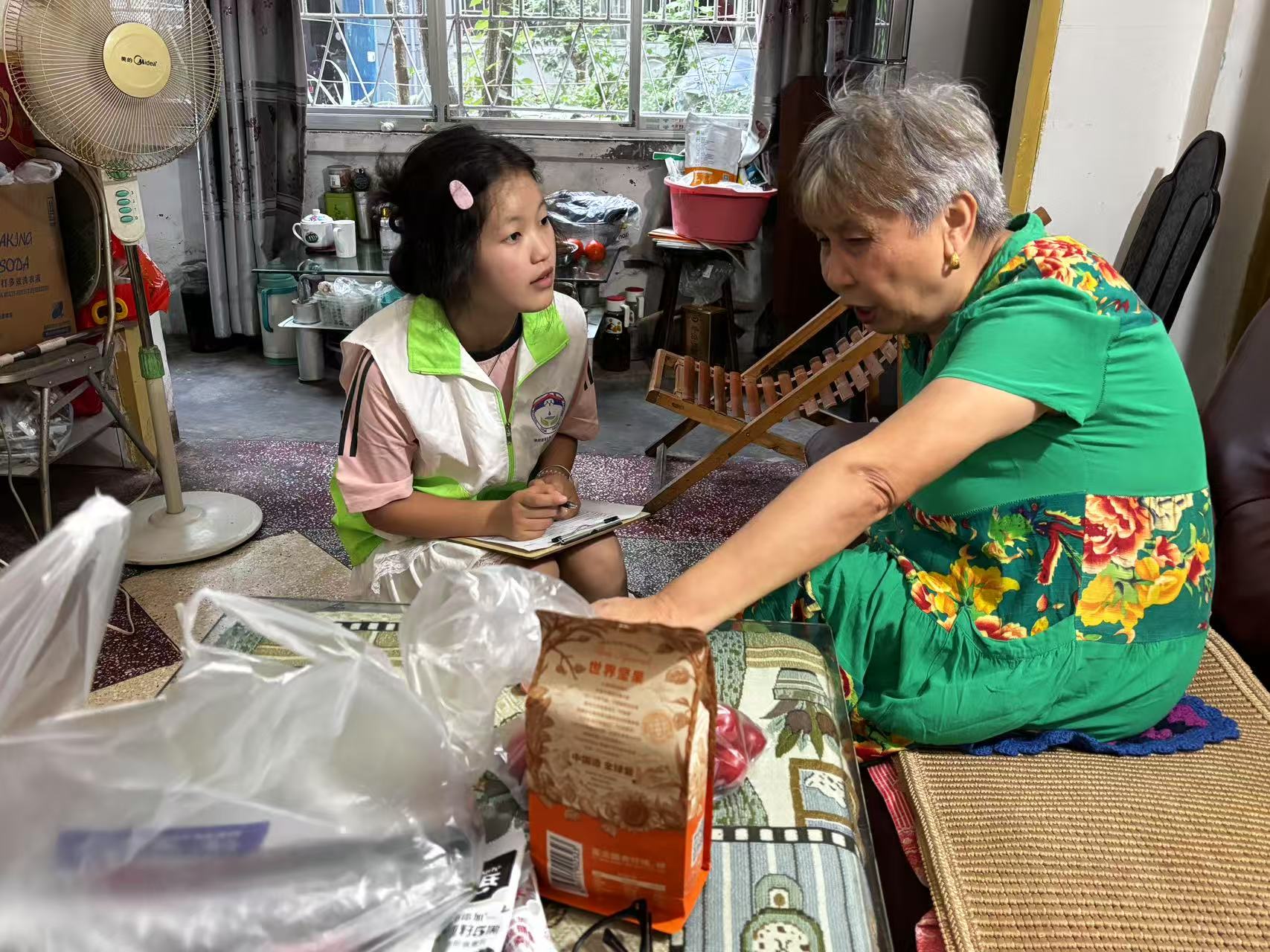在心理学邹赞横老师的带领下,大学生志愿者们走进了居民何中碧、黄天雄、王玉琼三位老人的家中,以入户访谈的形式传递关怀、倾听心声。为确保访谈效果,志愿者们在正式访谈前做了充分准备。他们依据前期访谈资料,精心调整制定访谈提纲,还采买了食盐、水果、蔬菜、麦片等食品作为上门礼物,展现了满满的诚意与关怀。