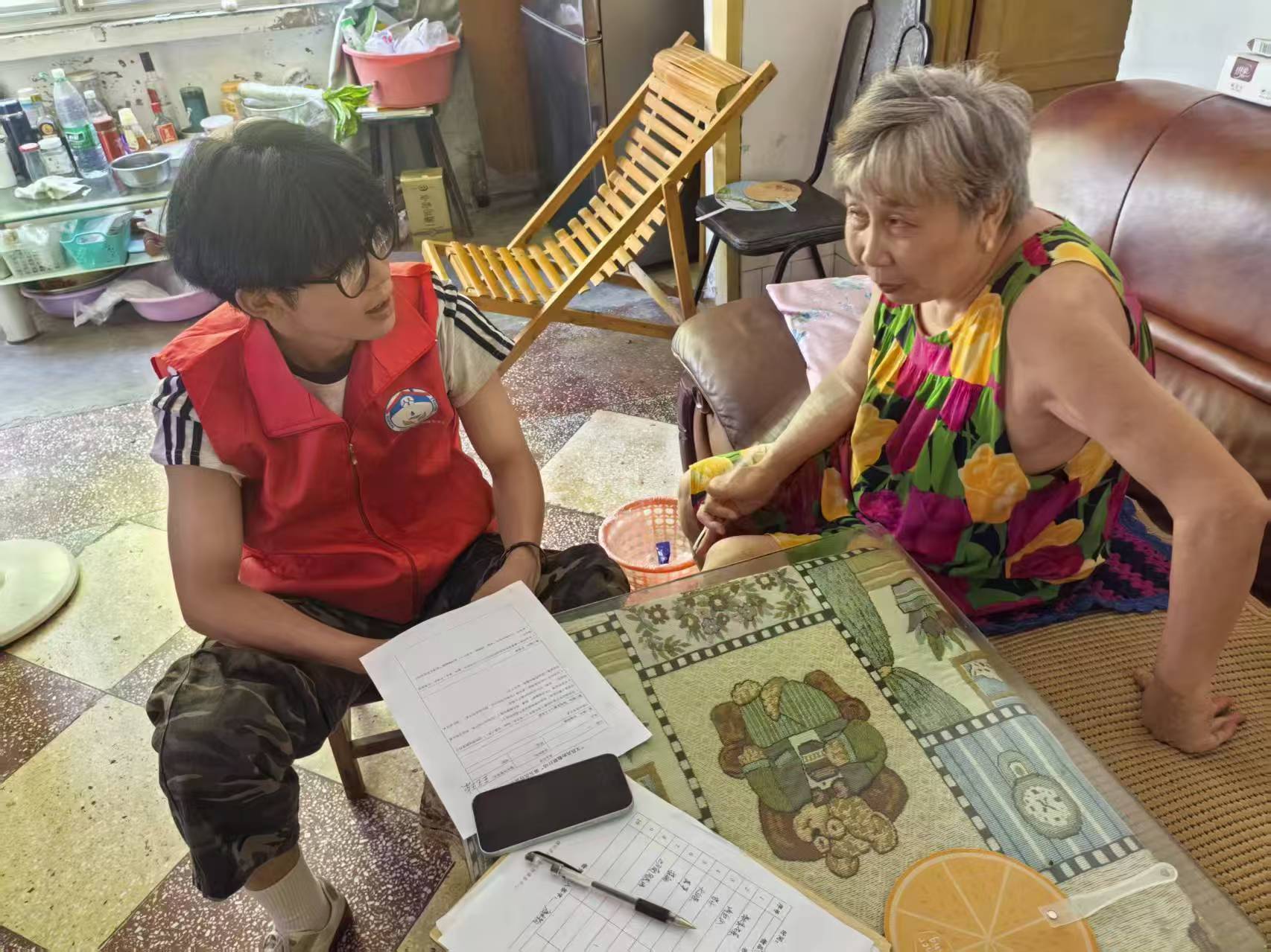 湜湜社工与铸爱团队通过共情式回应深化情感联结。志愿者以“您这些年真不容易”“谢谢分享这些宝贵经历”等话语给予情感支持,有效疏解老人的孤独感。当黄天雄提及父亲早年拒绝资助眼疾治疗的隐痛时,团队及时暂停话题转向倾听,守护其心理安全边界。访谈尾声,老人们与志愿者愉快约定参与后续社区活动,何中碧更坦言“说话有人听,心里暖和”,印证了温情陪伴对重建社会联结的关键价值。